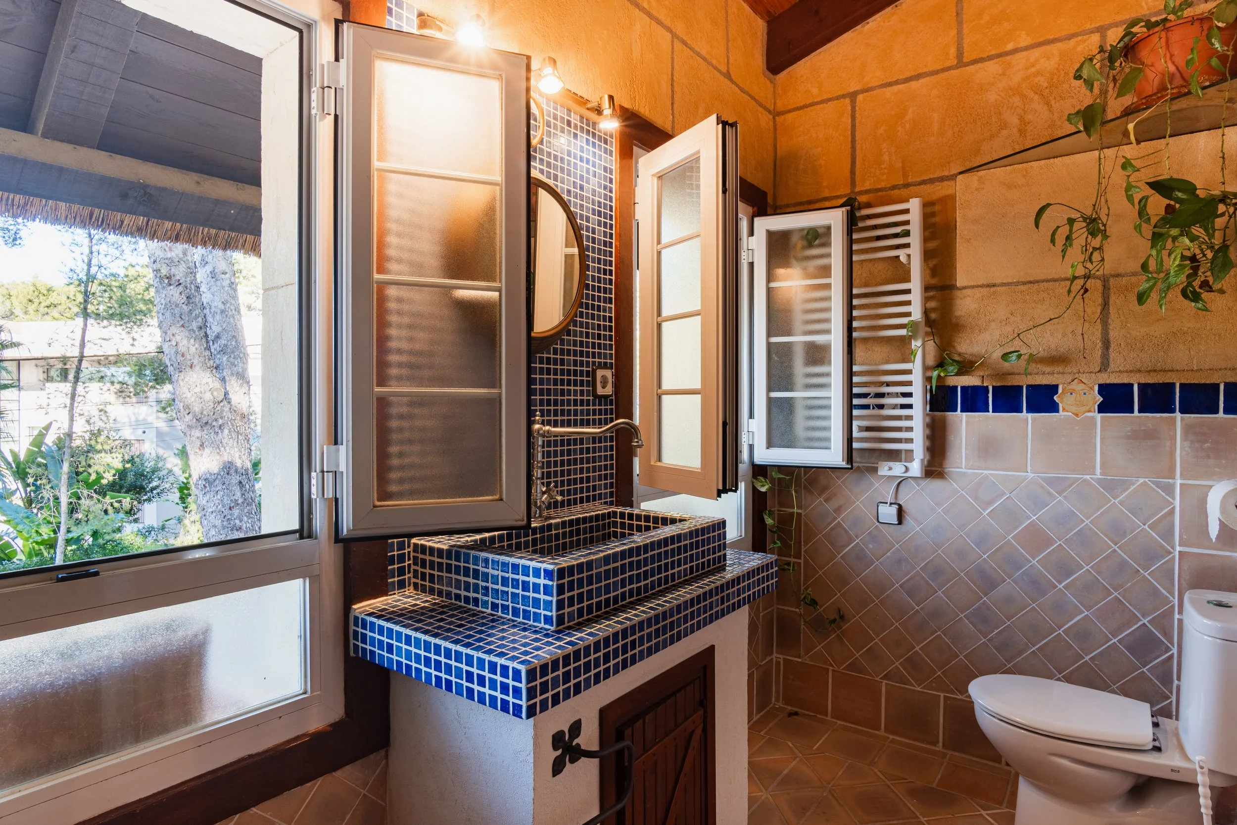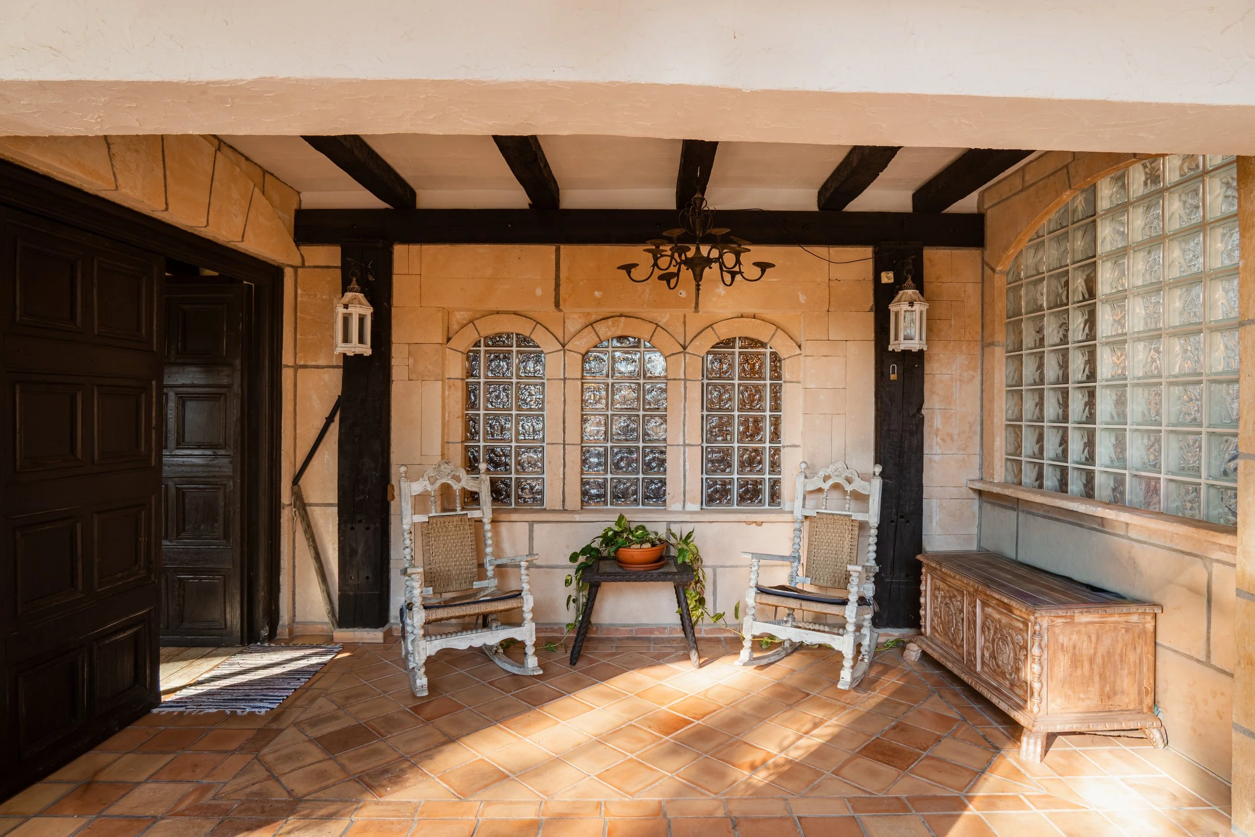 On the upper floors, exposed wooden beams add Mallorcan charm. The master suite has a dressing room, full bathroom, and covered terraces with panoramic views.