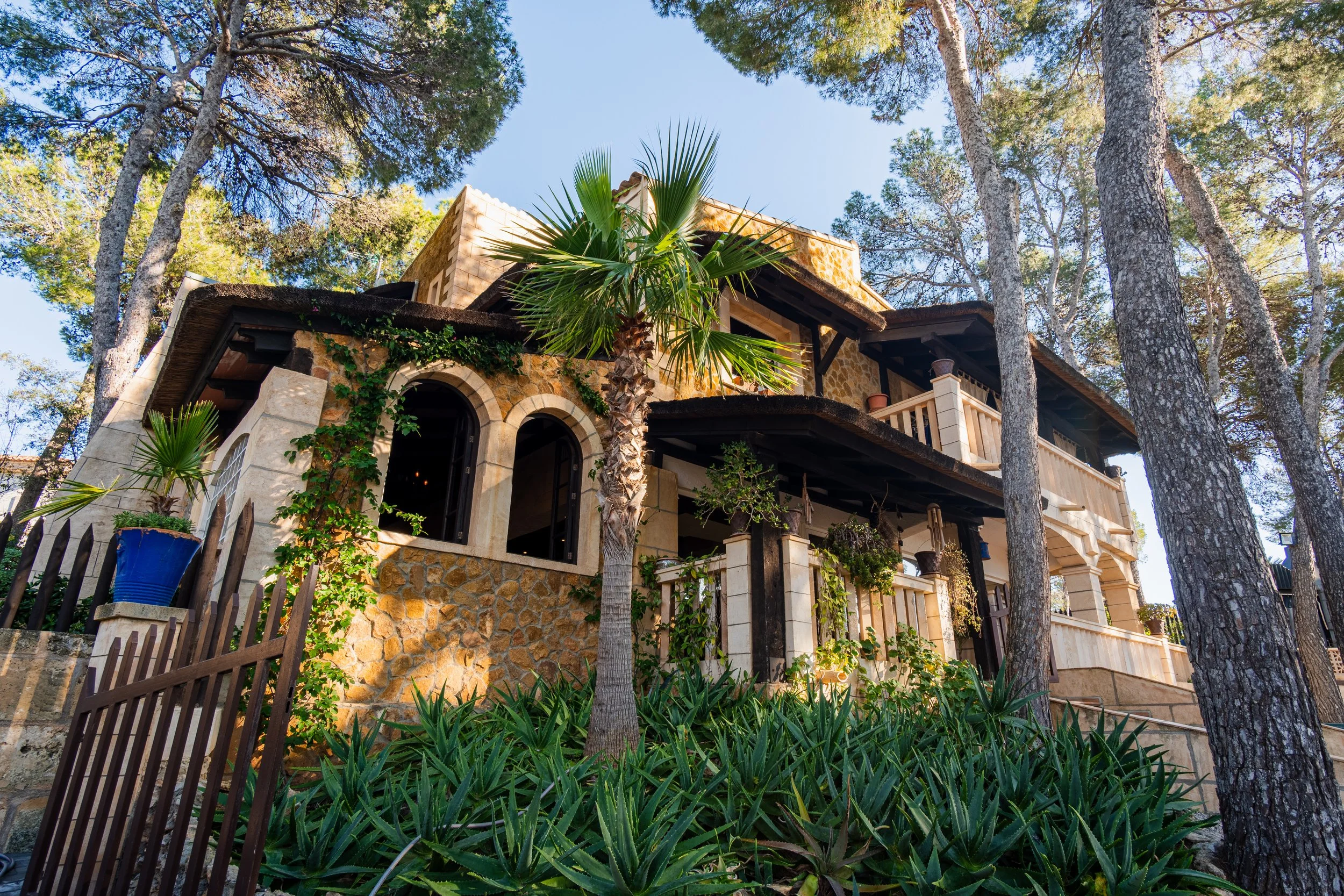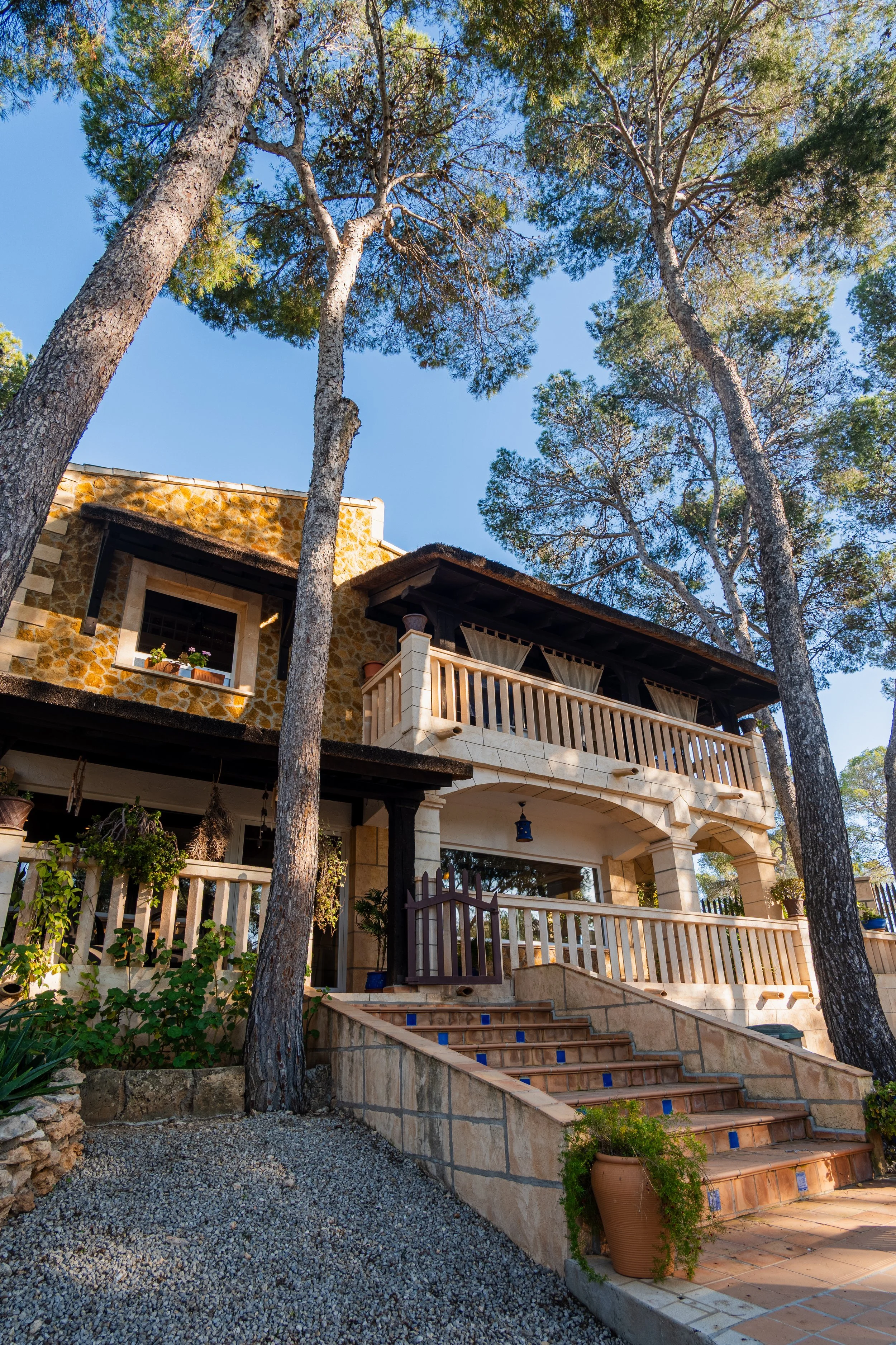 On the upper floors, exposed wooden beams add Mallorcan charm. The master suite has a dressing room, full bathroom, and covered terraces with panoramic views. Several parking spaces, two separate entrances with wrought iron gates, and a 38 m² storage room complete the offer.