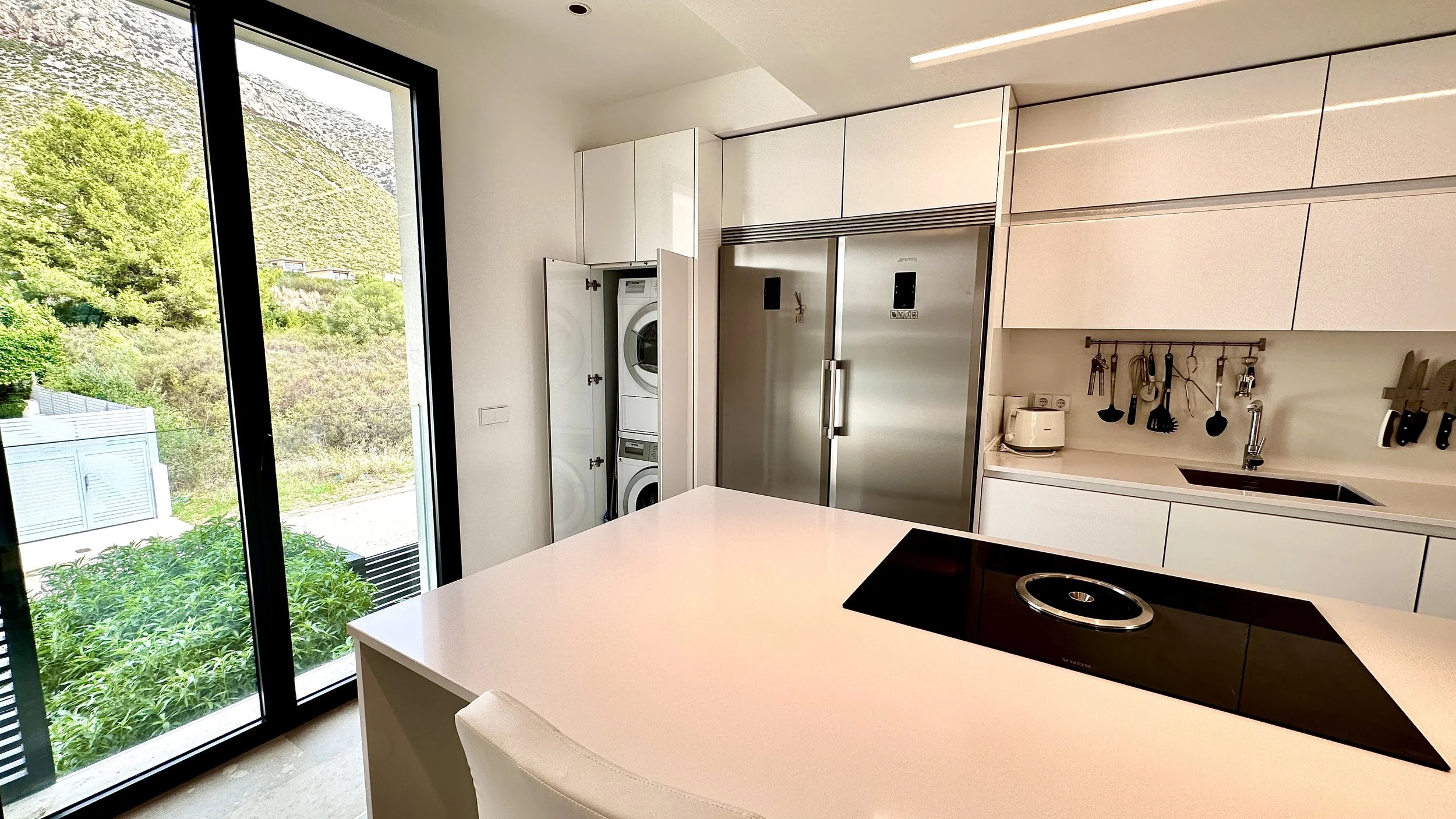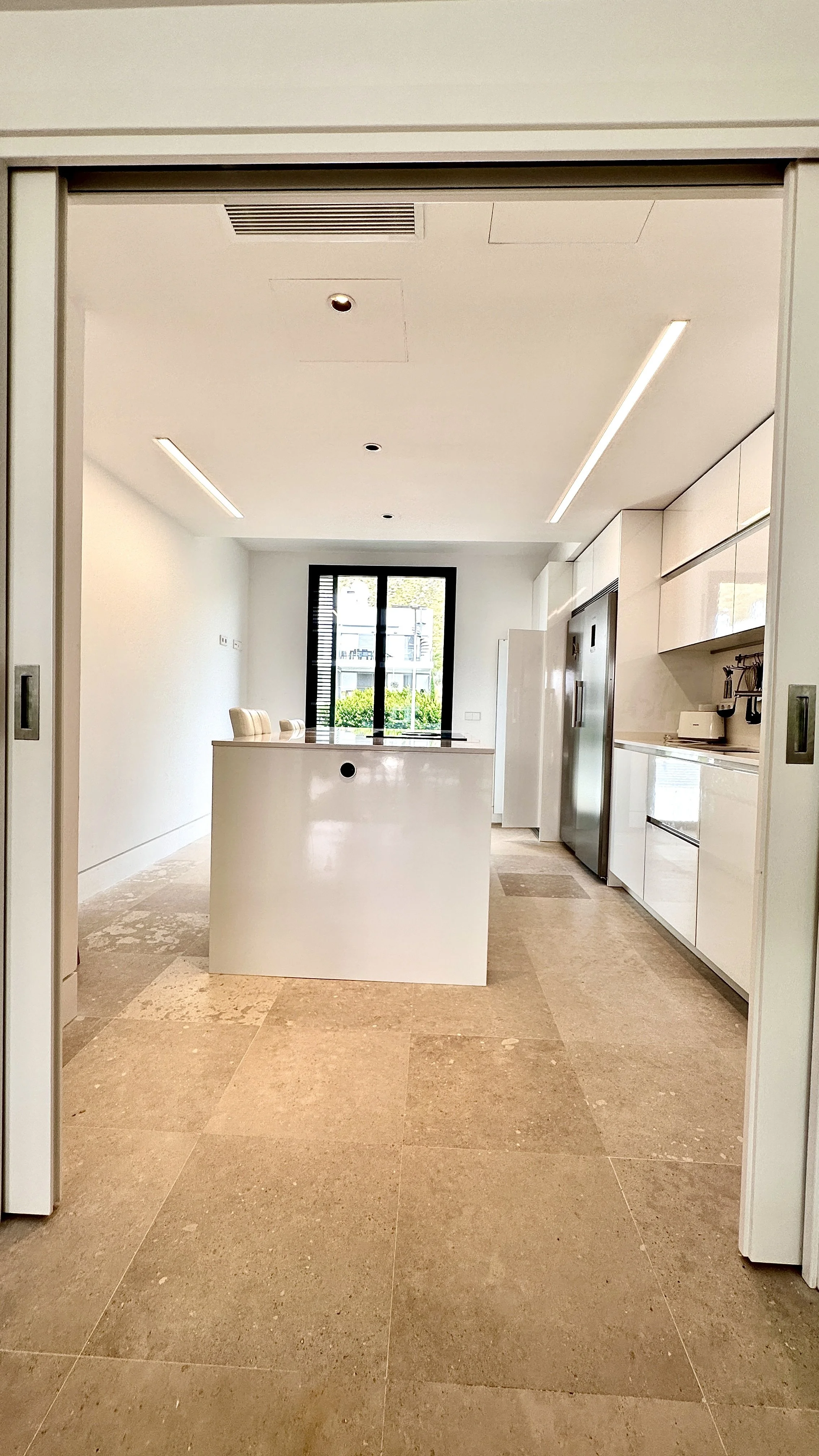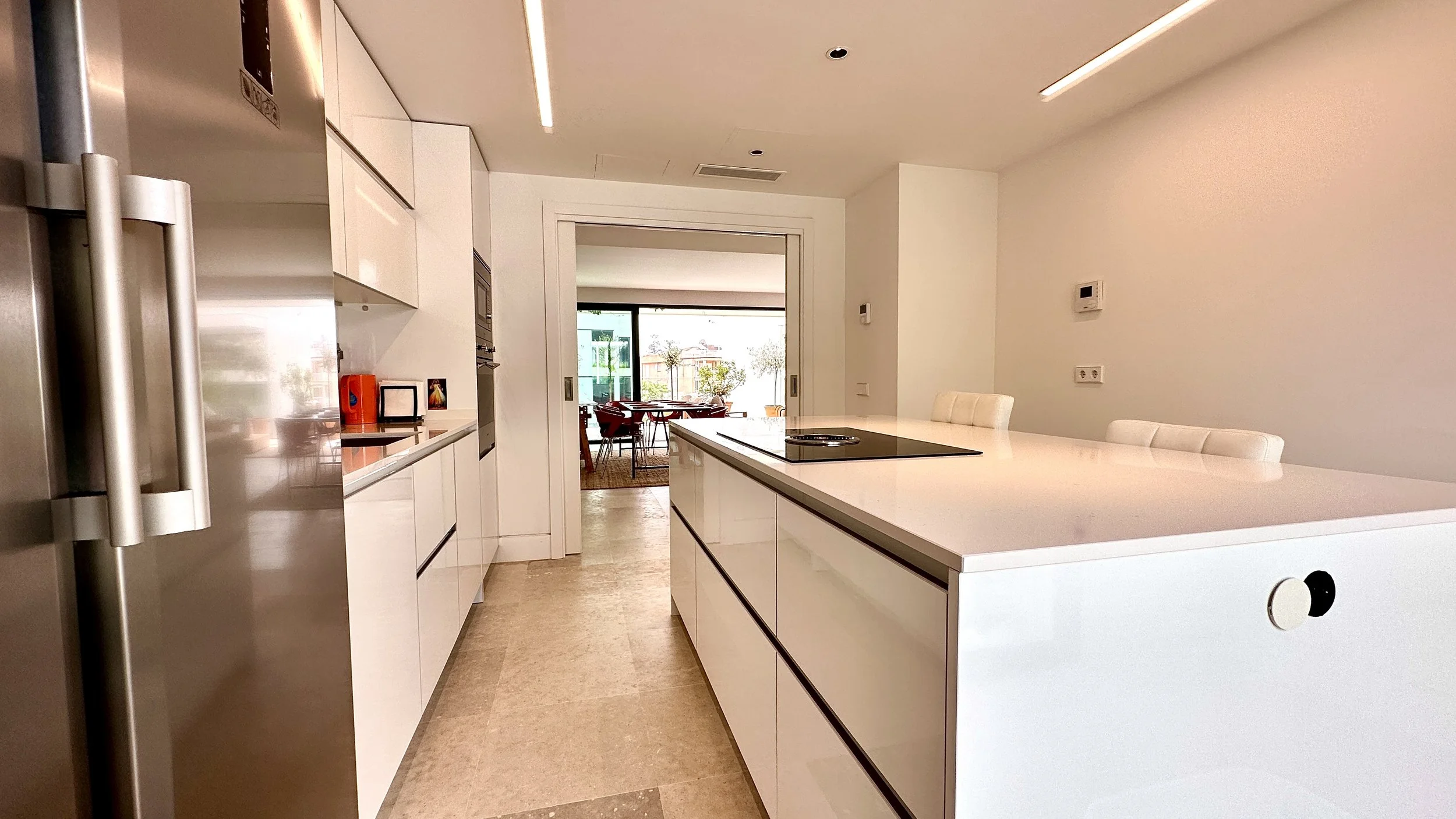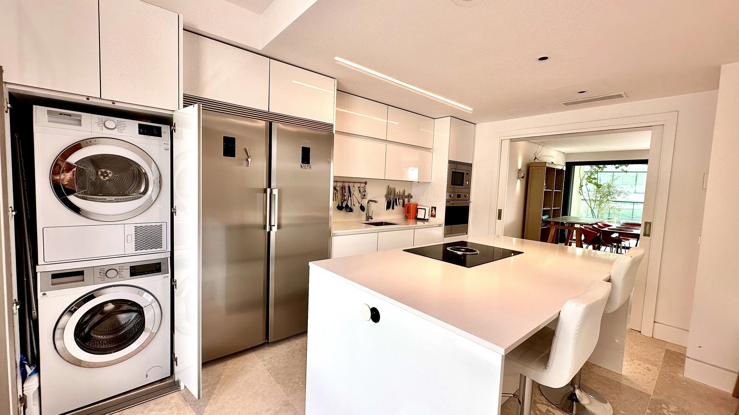 It has designer furniture, white lacquered kitchen, central dining peninsula.